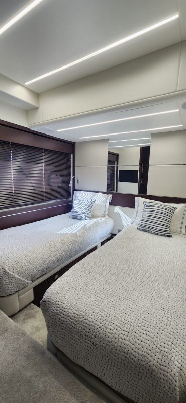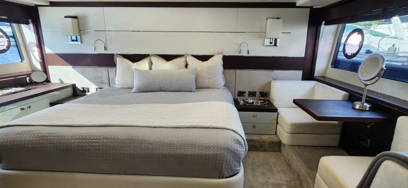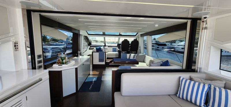 Step aboard and immediately feel the allure of modern European craftsmanship. The Predator 74′ is a sensory experience—her dark, sporty exterior turns heads while her light-drenched interior invites you to relax, indulge, and celebrate.